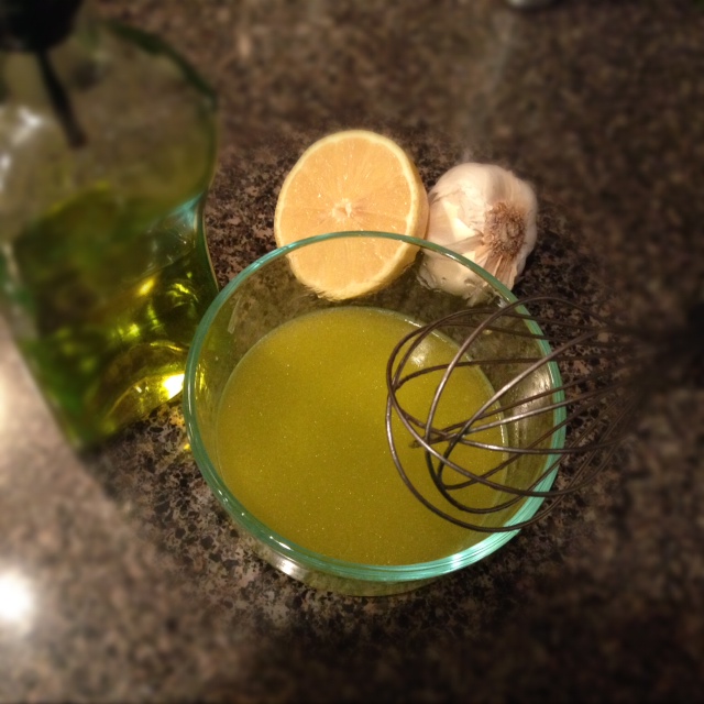 Olive oil, lemon, 1 small garlic clove salt, and pepper.